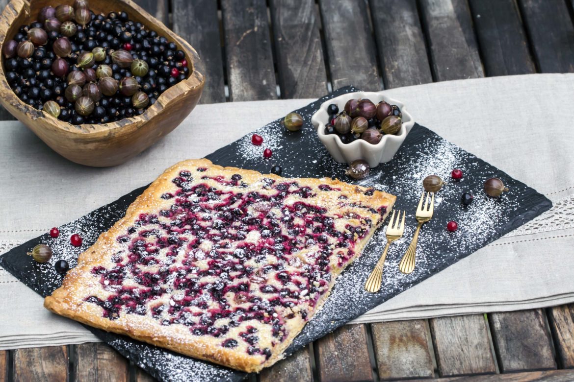 Sommerzeit ist Beerenzeit. Das Obstangebot nimmt jetzt stetig zu. Kirschen, Marillen und natürlich jede Menge Beeren. Walderdbeeren, Himbeeren, bald werden die ersten Brombeeren reif und im Wald habe ich schon die ersten Heidelbeeren gesichtet. Ich esse ja wirklich sehr gerne Äpfel und die Freude wird groß sein, wenn es im Herbst wieder die frisch geernteten, saftigen Äpfel gibt, aber die Beerenzeit ist doch auch immer etwas ganz Besonderes und für mich der Inbegriff vom Sommer. Das Füllhorn ist reich angefüllt, in den schönsten Farben, Formen und Geschmäckern. Nun ist genug für alle da. Die Vögel laben sich und trotz alledem fragen wir uns in Obstjahren wie diesen oft was tun mit den Beeren, wie verarbeiten? Es gibt ja zahlreiche Möglichkeiten… Müsli, Yoghurt, Obstsalat, Smoothie, Einkochen, Fruchtleder, Einfrieren… oder… Kuchen backen! Diesen einfachen Blechkuchen kann man mit fast jedem Obst backen und er ist garantiert seeehr lecker. Mit schwarzen Johannisbeeren und Stachelbeeren vereint er auf wunderbare und ausgewogene Weise die Geschmäcker süß und sauer, Dieser Kuchen hat bei uns nicht lange gehalten und der Ruf nach dem nächsten Kuchen wurde schon sehr schnell laut.