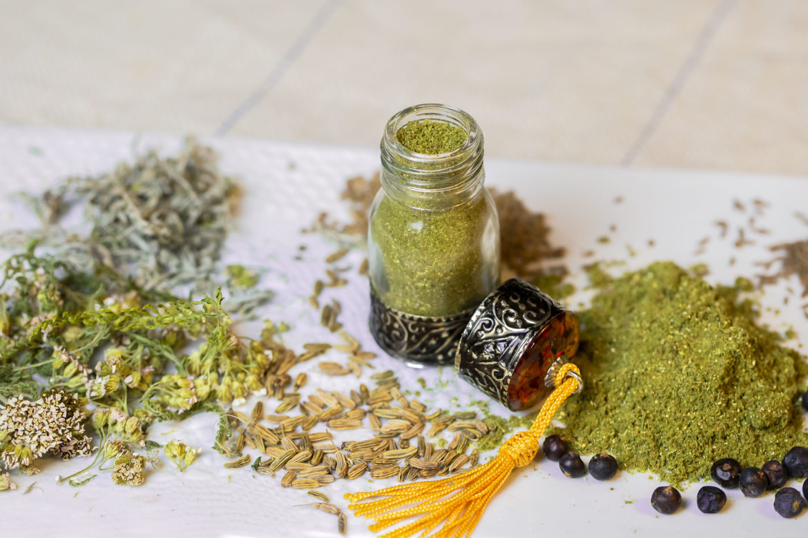 In meinem letzten Blogpost habe ich euch jede Menge Infos über Bitterstoffe gegeben und die Wichtigkeit und Auswirkung von Bitterstoffen auf unsere Körperfunktionen und vor allem für eine gesunden Stoffwechsel und die Gesundheit unserer Verdauungsorgane erklärt. Damit haben Bitterstoffe eine große Auswirkung auf unsere gesamte Gesundheit, denn die fängt bekanntlich ja im Darm an. Bitterstoffe können zudem auf unser mentales Wohlbefinden Einfluss nehmen, die Nerven stärken und uns damit unterstützen, auch im stressigen Alltag widerstandsfähiger zu sein und diesen zu meistern. Natürlich gehört hierzu auch eine gesunde Lebenseinstellung und ich empfehle regelmäßige Naturaufenthalte, denn sie wirken wie ein Lebenselixier und schaffen Ausgleich auf allen Ebenen. Das Bitterpulver, welches ich euch heute vorstellen möchte, geht auf den deutschen Autodidakten und Pflanzen- und Naturheilkundigen Bertrand Heidelberger (1845-1925) zurück. Es besteht aus sieben Bitterkräutern und kann als Pulver und als Tee eingenommen oder sparsam dosiert als Gewürz genutzt werden. Es ist super praktisch, denn man kann sich das Pulver ganz leicht selber machen und ein kleines Fläschchen davon stets in der Tasche dabei haben. Auf diese Weise ist es bei Bedarf jederzeit einsatzbereit.  Auch für eine Bitterkur ist das Pulver gut geeignet. Nach der Weihnachtszeit, wo meistens viel und gerne auch süß und fett gegessen wird, tut das ganz gut. Die Bitterstoffe helfen übrigens auch direkt bei der Verdauung von fetten Speisen. Stichwort „Beifuß“ für Gänsebraten, das ist eines der besten und klassischten Beispiele.
