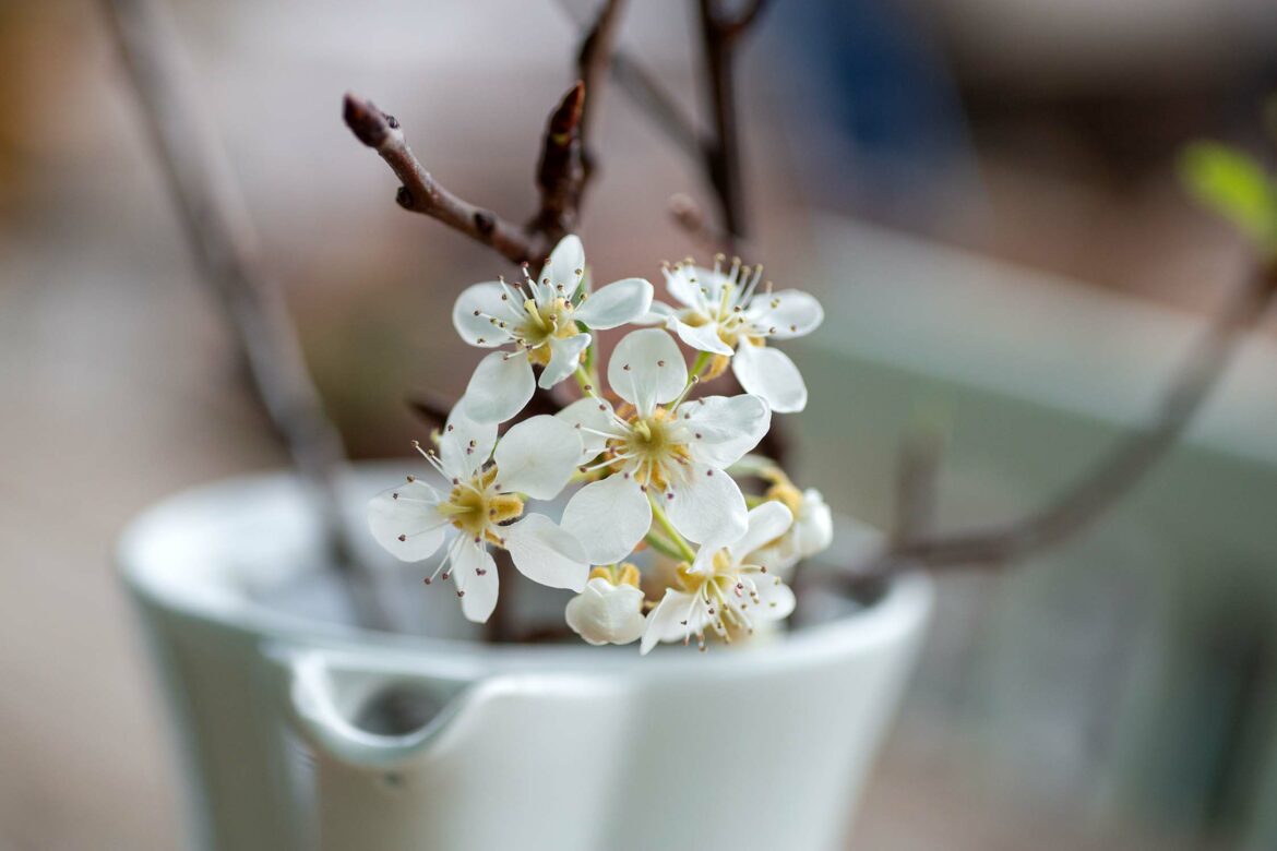 In diesem Jahr habe ich Apfel- und Traubenkirschenzweige geschnitten. Die Apfelblüten sind die größeren Blüten im Bild, die Traubenkirschenblüten sind zu traubigen, länglichen Blütenständen zusammengefasst. Im Bild seht ihr oben rechts schon die Knospen.